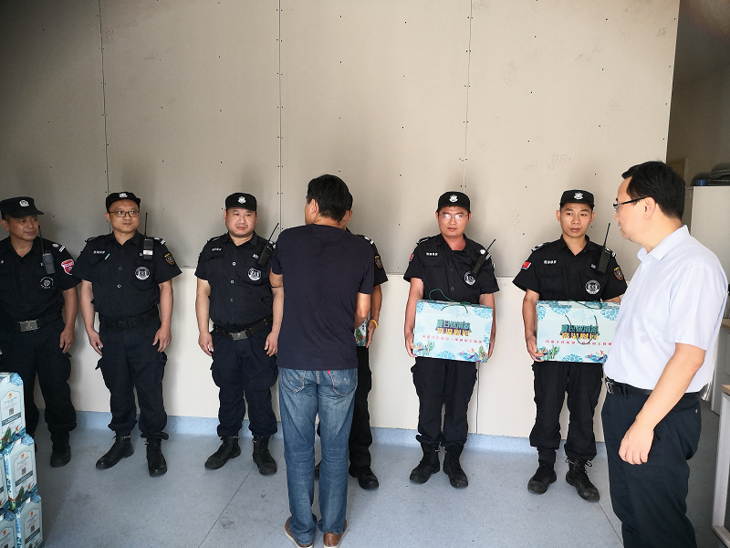 8月5日,文新街道主任屠立衡、文新派出所所長(zhǎng)張勇,教導(dǎo)員鄭在利等領(lǐng)導(dǎo)一行走訪慰問(wèn)在高溫酷暑下堅(jiān)守崗位一線的我司文新中隊(duì)駐守的25號(hào)省領(lǐng)導(dǎo)駐地崗?fù)ず?4號(hào)西城廣場(chǎng)崗?fù)?/span>隊(duì)員,送上防暑降溫用品,代表街道黨工委、辦事處、派出所和總工會(huì)對(duì)隊(duì)員一如既往堅(jiān)守工作崗位表示感謝和敬意。充分肯定駐點(diǎn)保安隊(duì)員的工作,尤其是出色完成省領(lǐng)導(dǎo)駐地的外圍治安巡邏保障工作。
